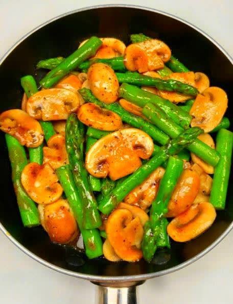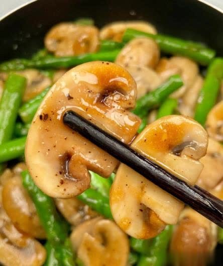 5. 调味:加入适量酱油,盐,白胡椒粉调味,喜欢口味丰富的可以加入少许鸡精。快速翻炒均匀,让蘑菇和芦笋吸收调料。
