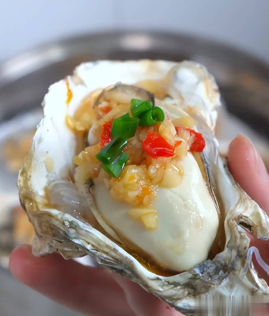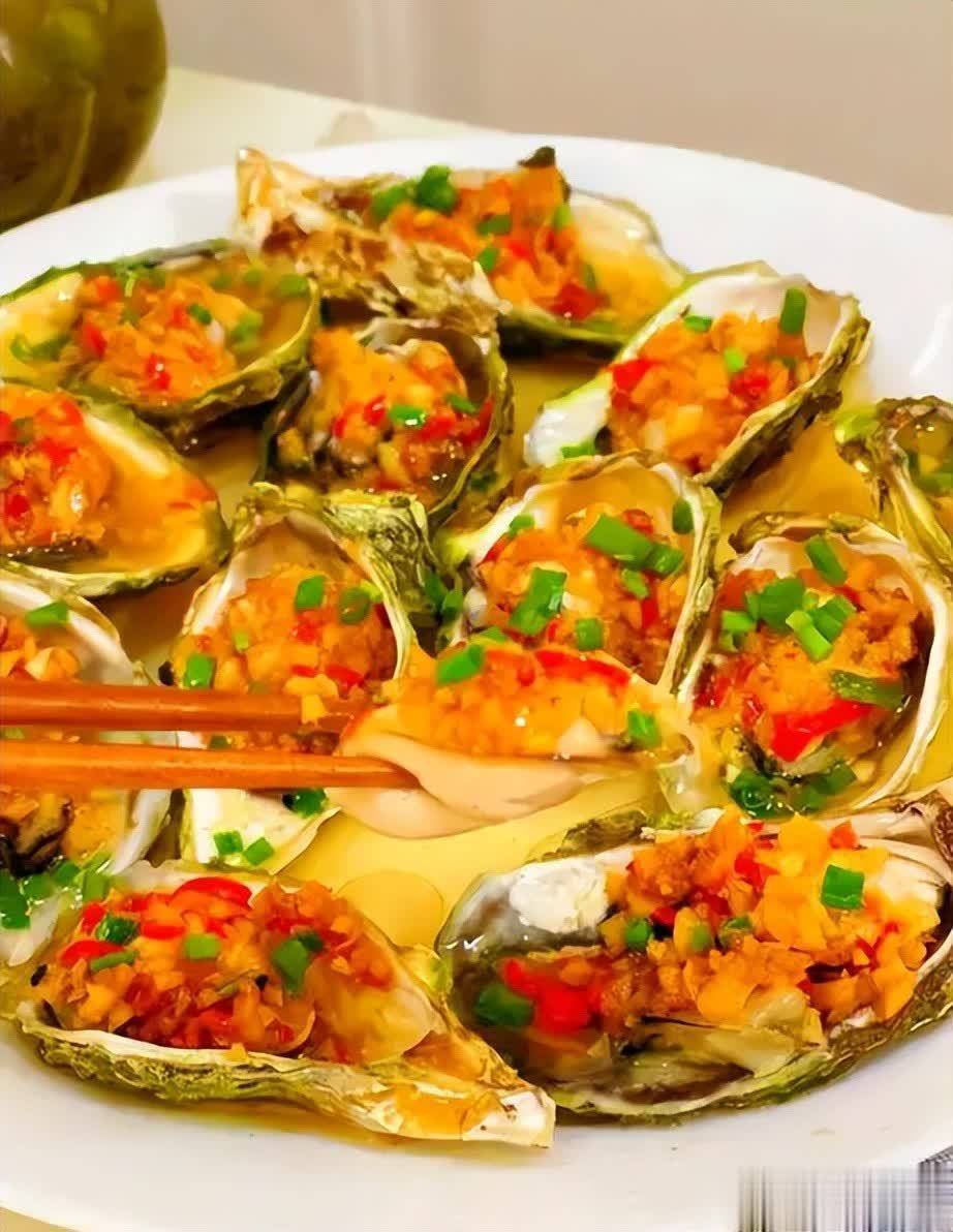 7. 装盘与装饰:蒸好后的牡蛎取出,撒上葱花和切好的红辣椒圈作为装饰,最后淋上一些热油以增加香味。可以再撒上一些香菜提味和装饰。