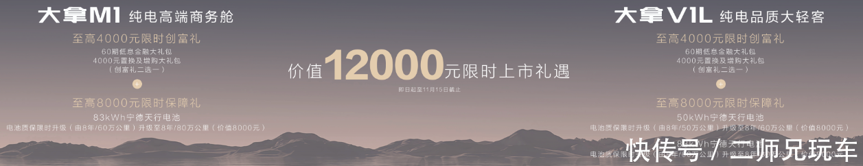 其中,纯电高端商务舱大拿M1,搭载83度宁德天行电池售价19.78万元起;纯电品质大轻客大拿V1L,83度宁德天行电池版售价17.08万元起;50度宁德天行电池版售价12.48万元起,限时一口价9.58万元起。新车上市之际,还带来价值12000元得丰厚限时上市礼遇。